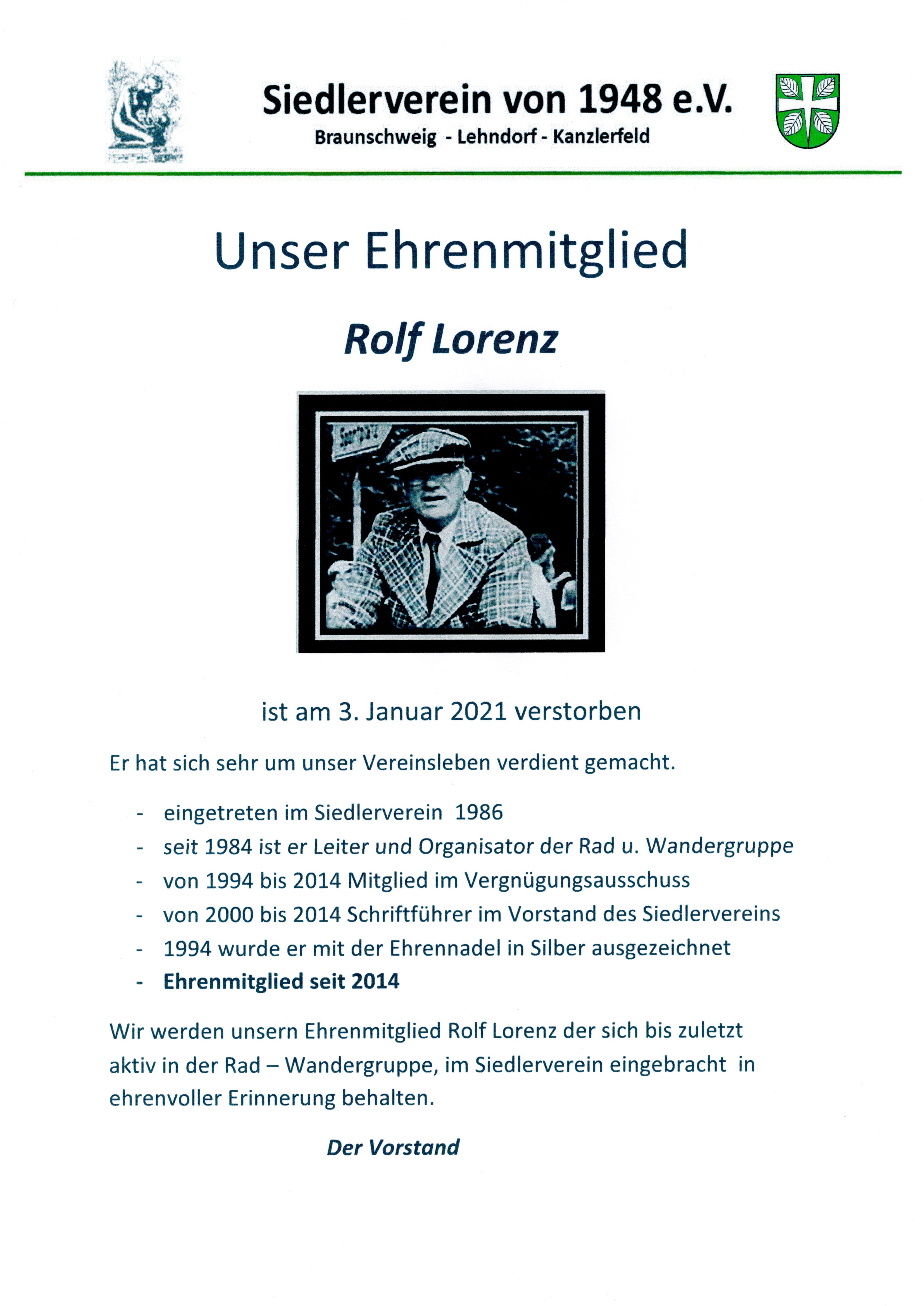 Trauer um unser langjähriges Ehrenmitglied Rolf Lorenz