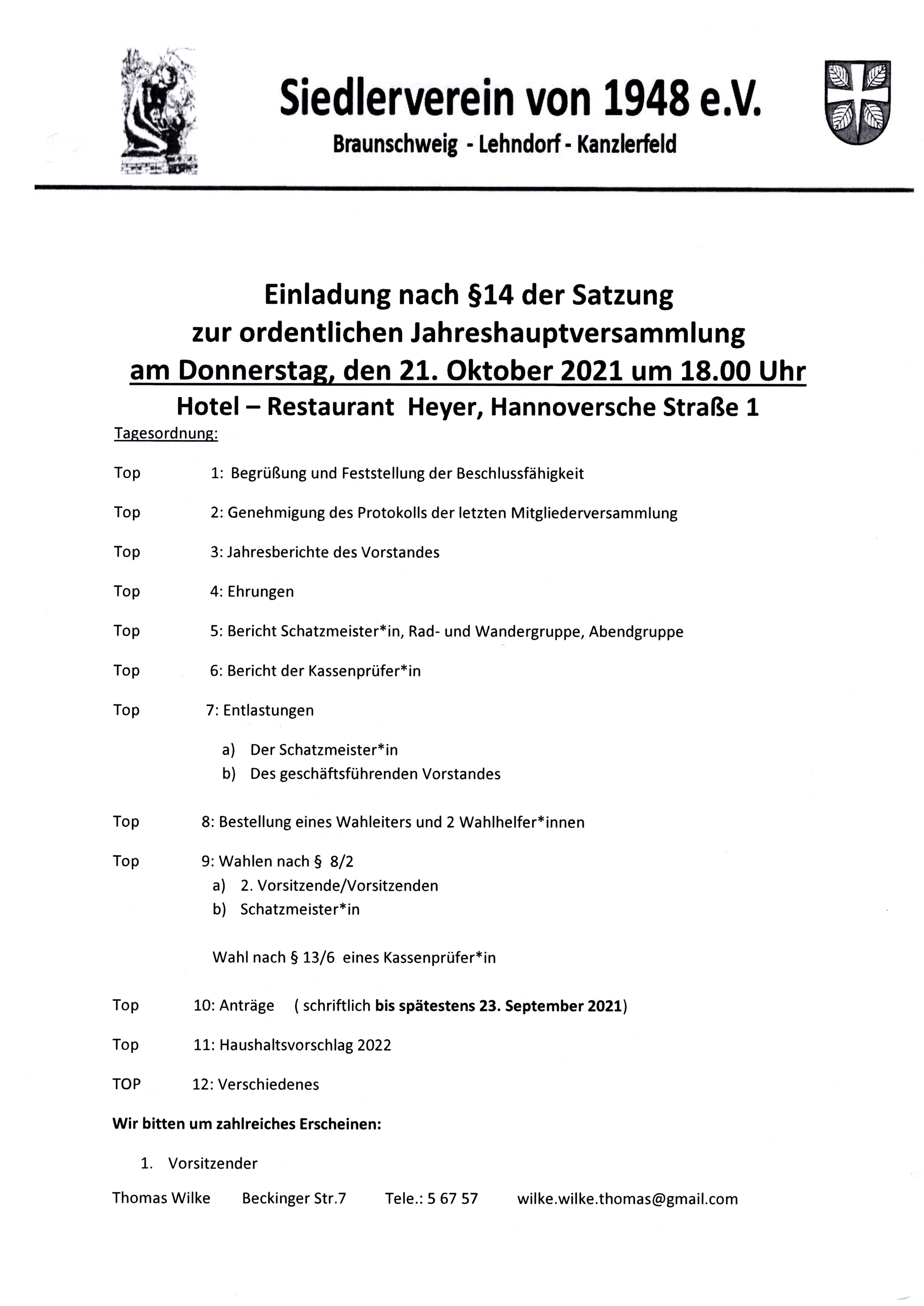 Jahreshauptversammlung, Donnerstag den 17. März 2022 um 18 Uhr
