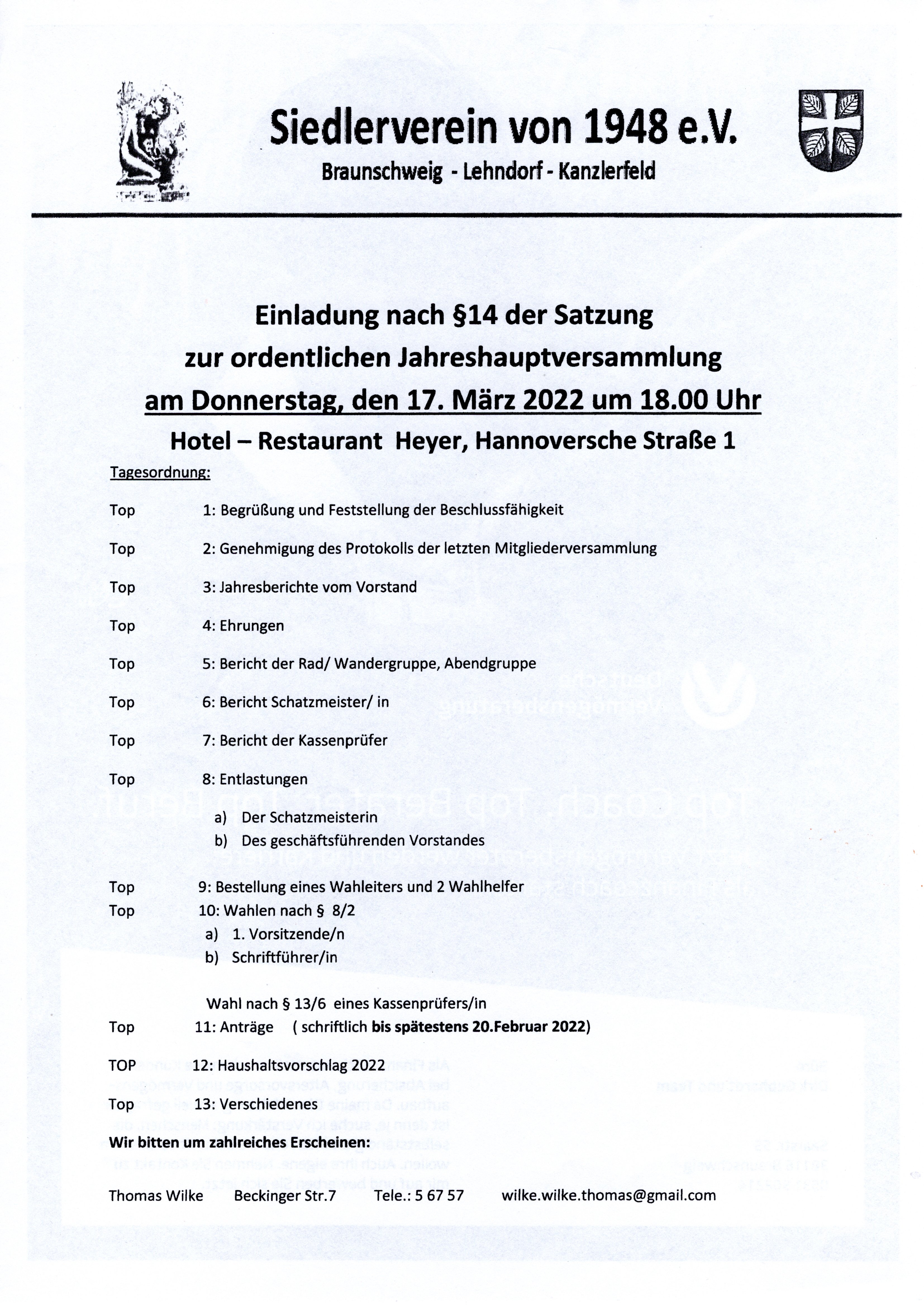 Jahreshauptversammlung, Donnerstag den 17. März 2022 um 18 Uhr